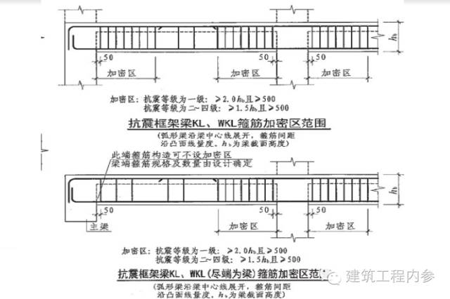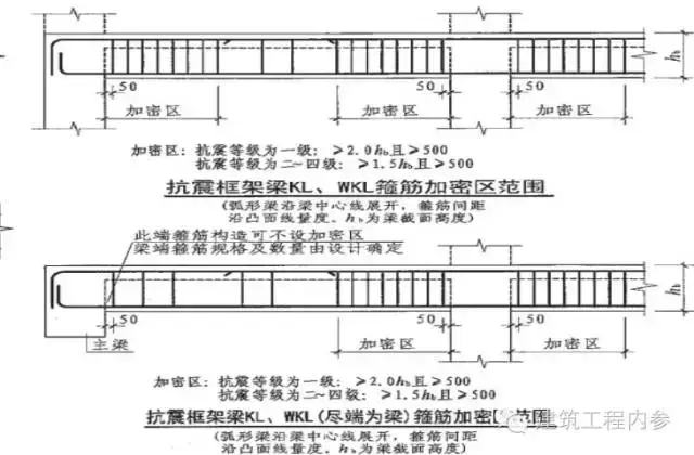 【11G101-1圖集(85頁)】規(guī)定:抗震框架梁箍筋加密區(qū)范圍規(guī)定:抗震等級為一級: ≥2.0hb ≥500;抗震等級為二~四級: ≥1.5hb ≥500;(hb為梁截面高度)