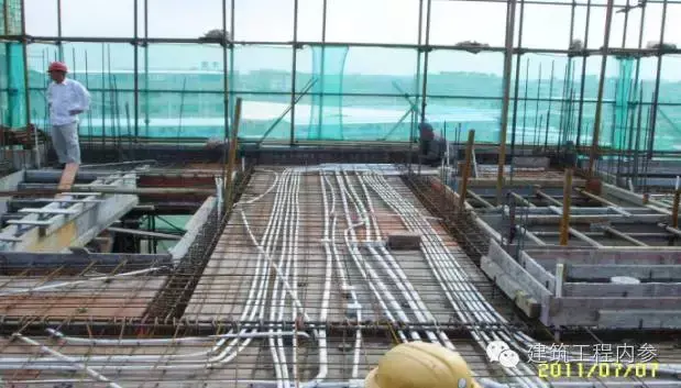 規(guī)范【 GB50303-2002第14.2.6 及第3.3.11 條】規(guī)定 :暗配的導(dǎo)管的埋設(shè)深度與建筑物、構(gòu)筑物表面的距離不應(yīng)小于15mm,應(yīng)排列整齊,固定點間距均勻,在底層鋼筋綁扎完成,上層鋼筋未綁扎前敷設(shè),且檢查確認,才能綁扎上層鋼筋和澆搗混凝土。