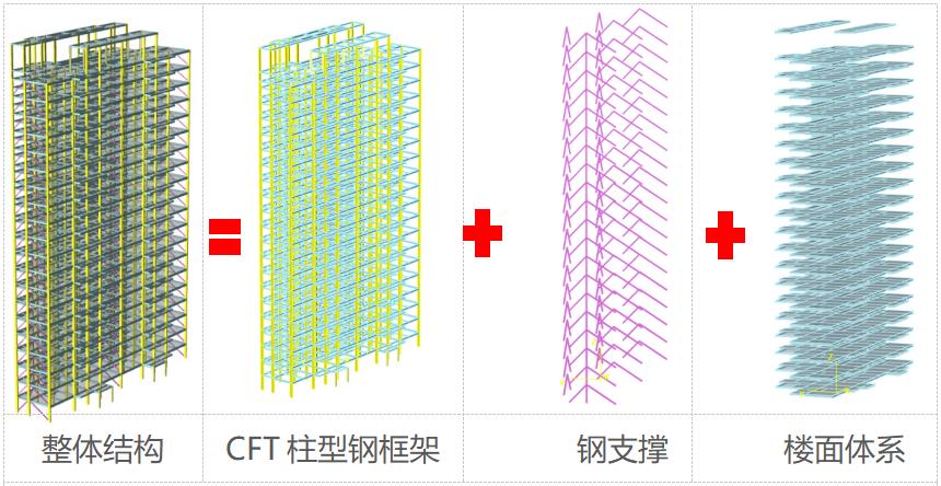 本項(xiàng)目鋼結(jié)構(gòu)采用CFT柱型鋼框架-支撐體系。從圖2可以看出,鋼支撐布置在無窗外墻、分戶墻、樓梯間處,不影響建筑使用功能;鋼柱、鋼梁可暗藏于建筑墻體內(nèi),結(jié)構(gòu)布置與建筑具有很高的匹配性,可為精裝修設(shè)計(jì)帶來便利。