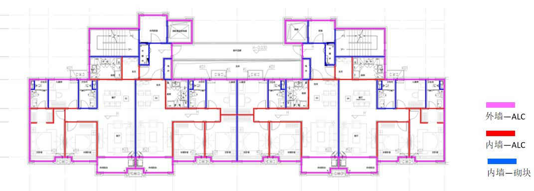 按評分細(xì)則,內(nèi)隔墻非砌筑比例需≥50%,采取ALC條板墻與局部砌塊墻相結(jié)合的做法。在公區(qū)、戶間墻、有水房間(廚衛(wèi))等區(qū)域采用砌塊墻,此外均選用ALC條板墻。