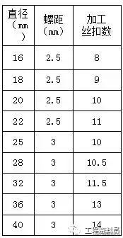 2)鋼筋接頭剝肋、滾絲時(shí)必須將機(jī)器調(diào)校平整,并根據(jù)鋼筋直徑和套筒長度調(diào)整好限位器,避免攻絲過長或偏短。接頭攻絲長2 度應(yīng)根據(jù)套筒長度、螺距確定,絲頭有效長度≥1/2直螺紋套筒長度,絲頭完整有效絲扣數(shù)不同廠家會(huì)有不同技術(shù)參數(shù)要求,加工時(shí)應(yīng)結(jié)合套筒生產(chǎn)廠家技術(shù)參數(shù)確定。一般情況下:鋼筋直徑16~22螺距為2.5mm,直徑25~40螺距為3.0mm,加工長度如表:
