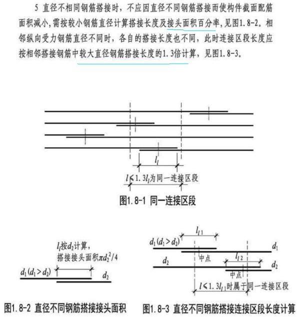 3、縱向鋼筋綁扎搭接時(shí),同一連接區(qū)段的范圍、接頭百分率的要求、計(jì)算構(gòu)件接頭百分率的方法、接頭布置原則、鋼筋直徑不同時(shí)接頭面積百分率與同一連接區(qū)段長度的取值原則,如圖1、2所示