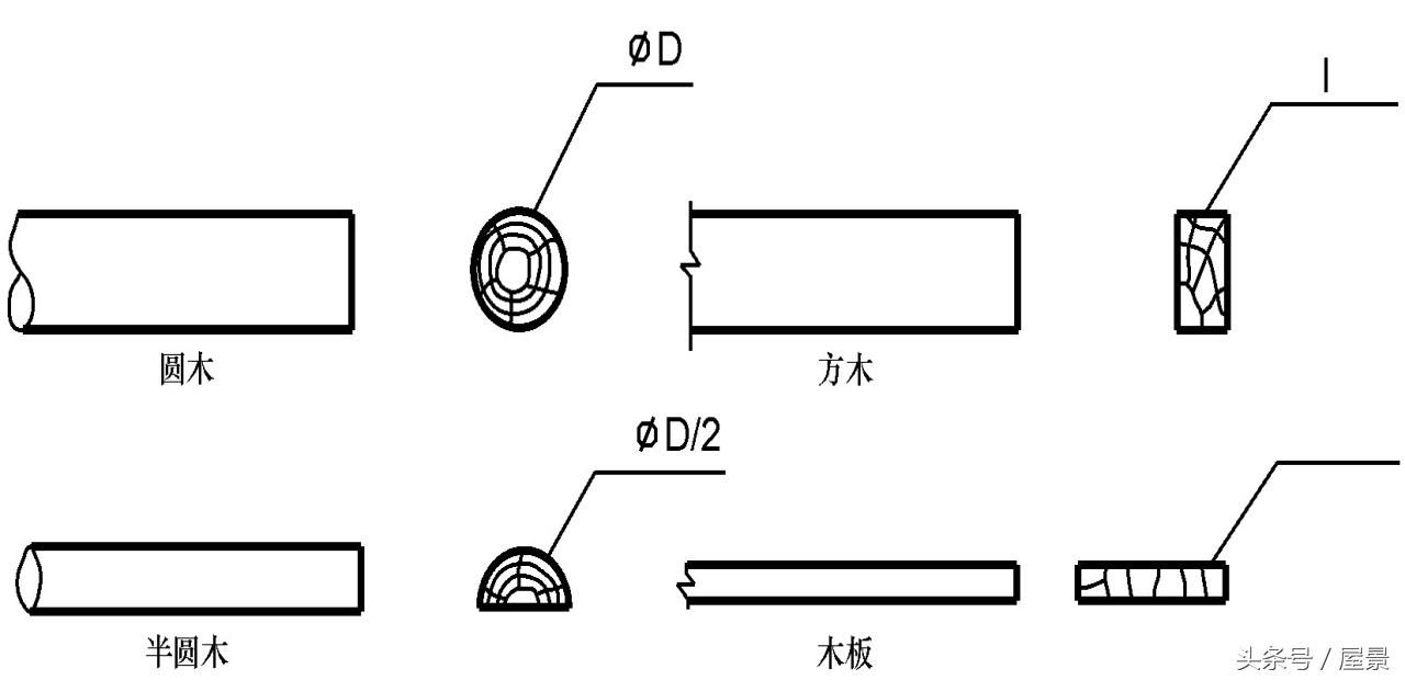 木結(jié)構(gòu)常用的木材有圓木、半圓木、方木和木板四種。國標(biāo)規(guī)定圖例如下圖 。
